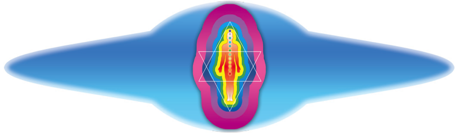 Gli esseri umani hanno un corpo fisico, uno mentale, uno emotivo e uno energetico (aura) a forma di Tetraedro Stella. I triangoli intrecciati rappresentano l’energia maschile e quella femminile in perfetto equilibrio.