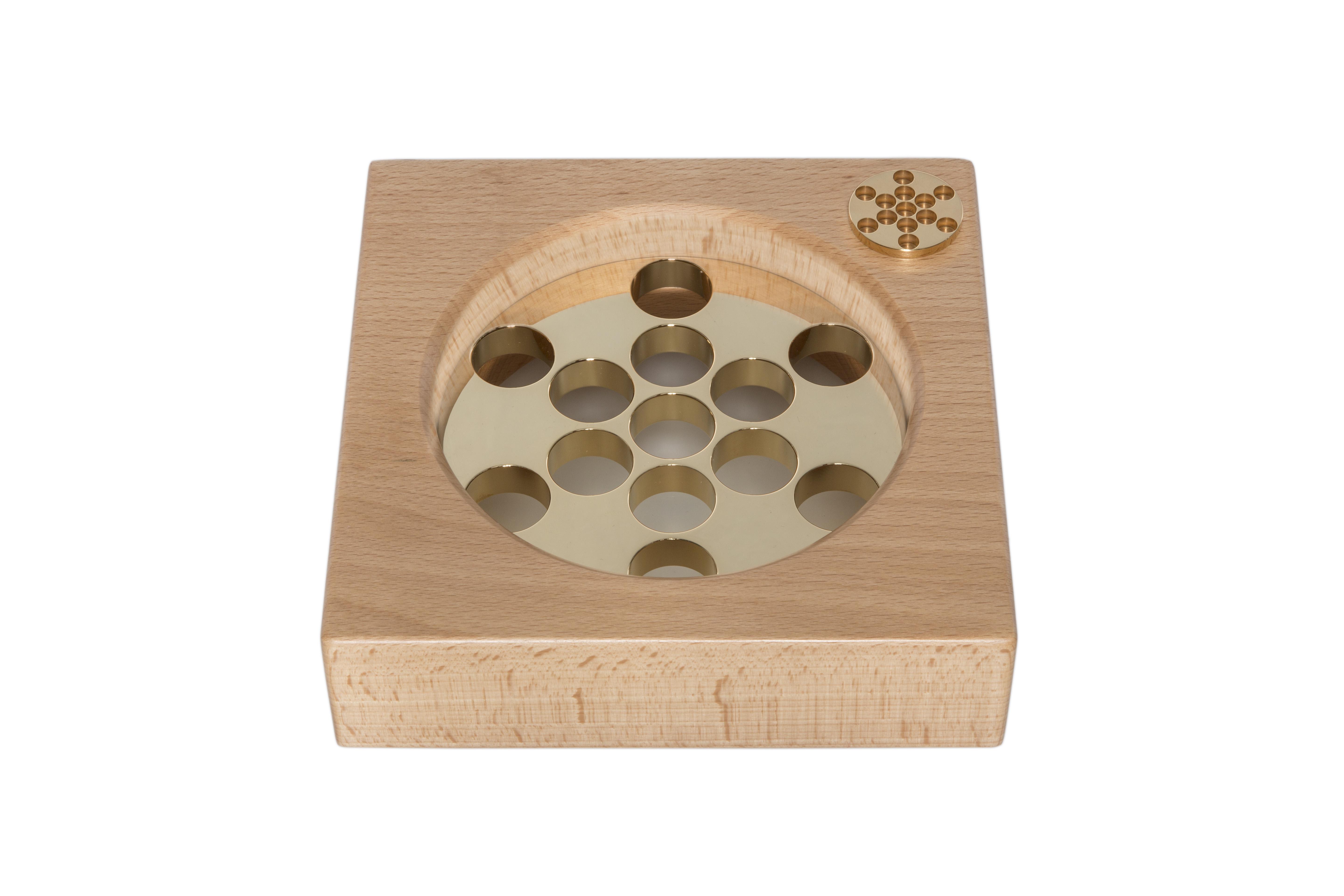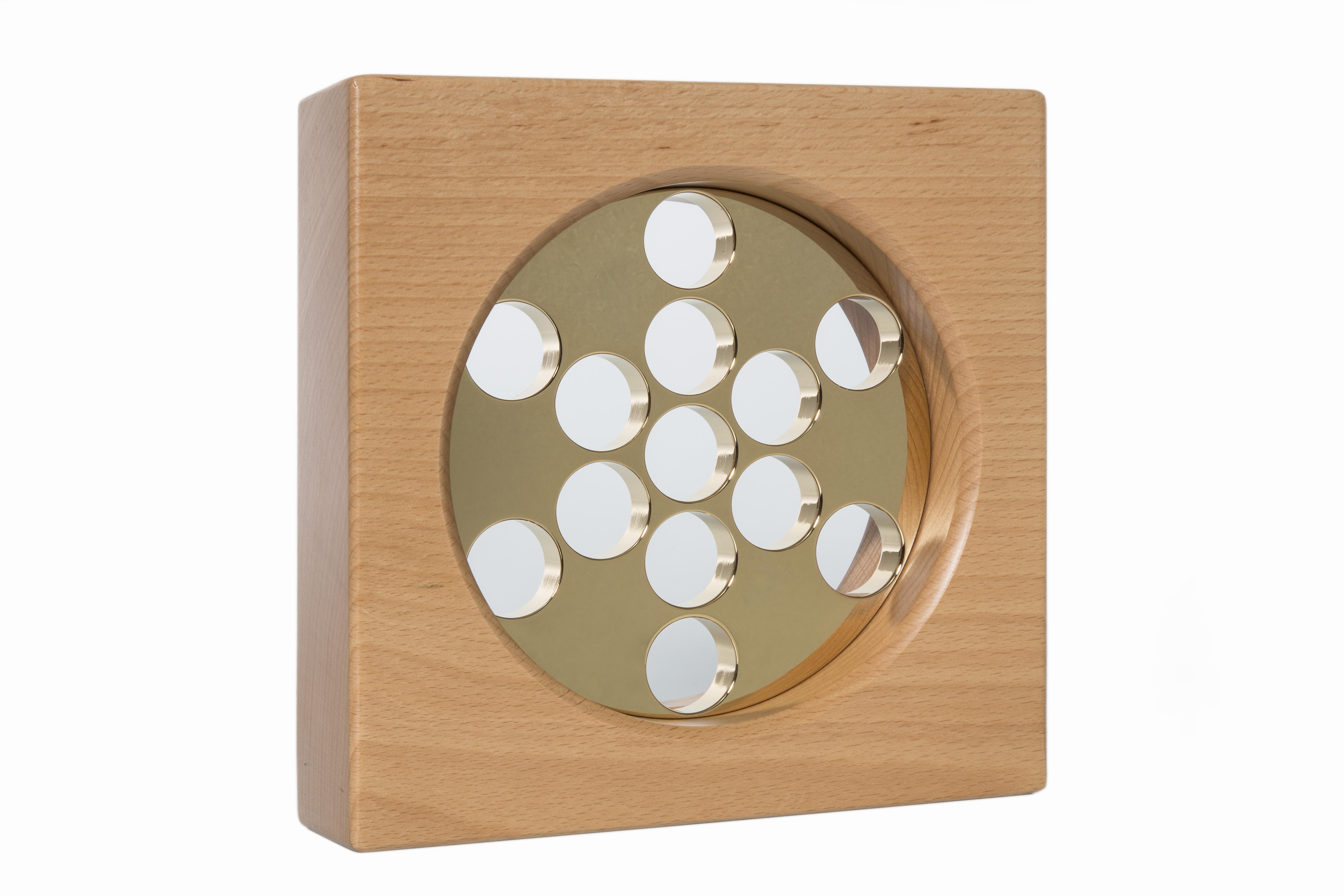 20 x 20 x 5 cm, 1,8 kg, ottone dorato, cornice in legno di faggio